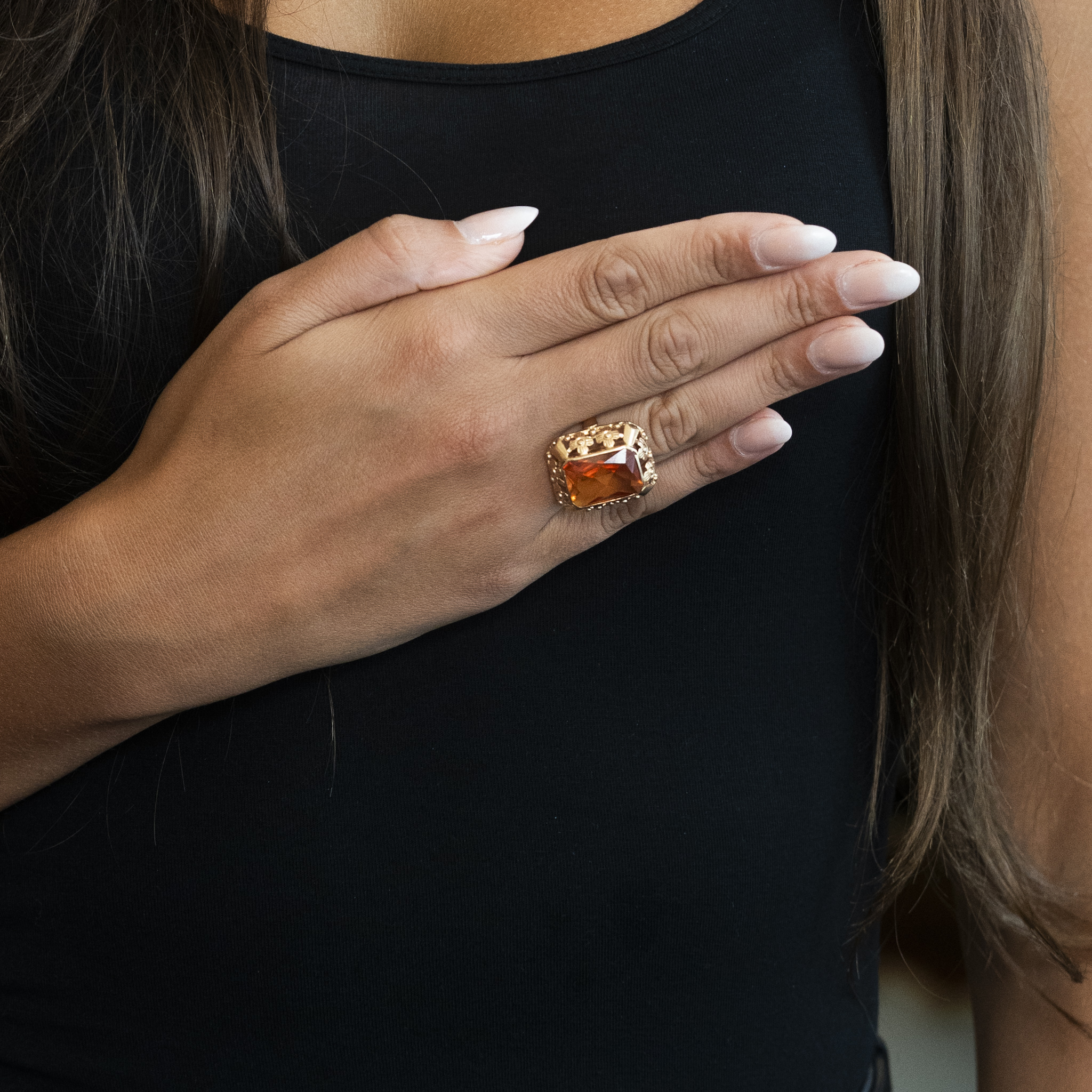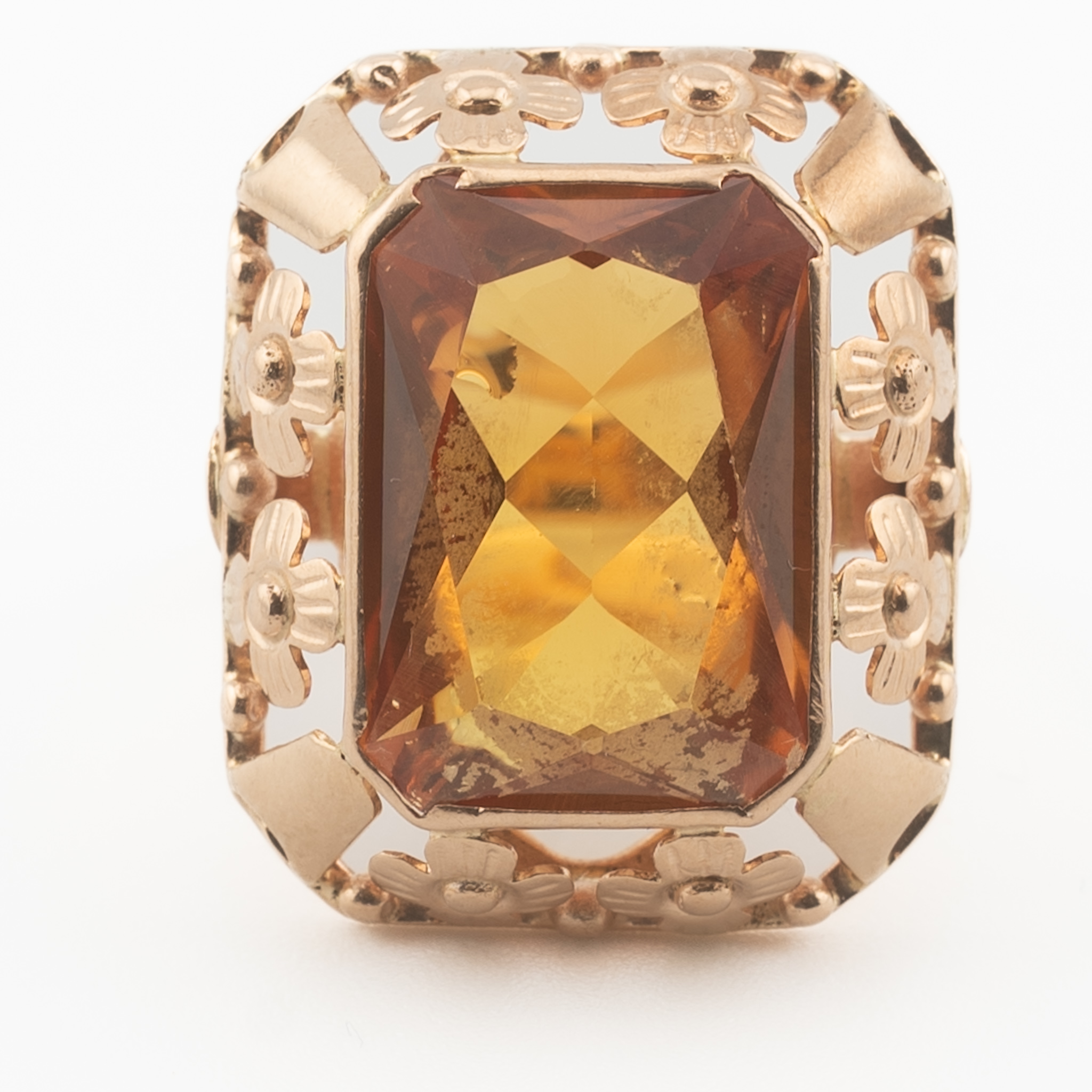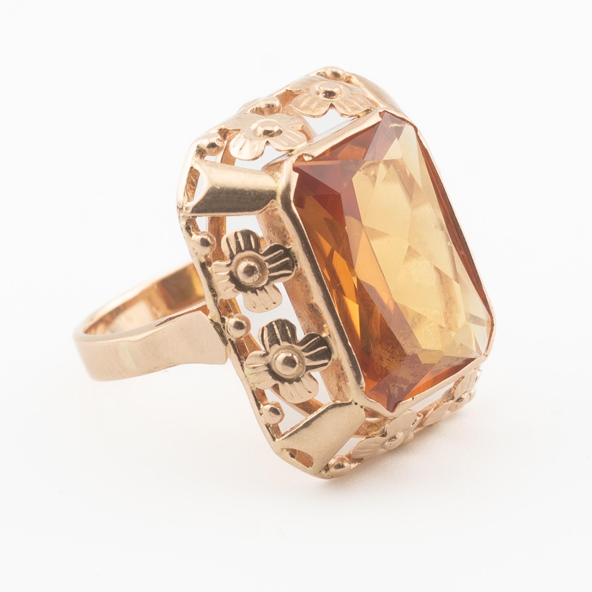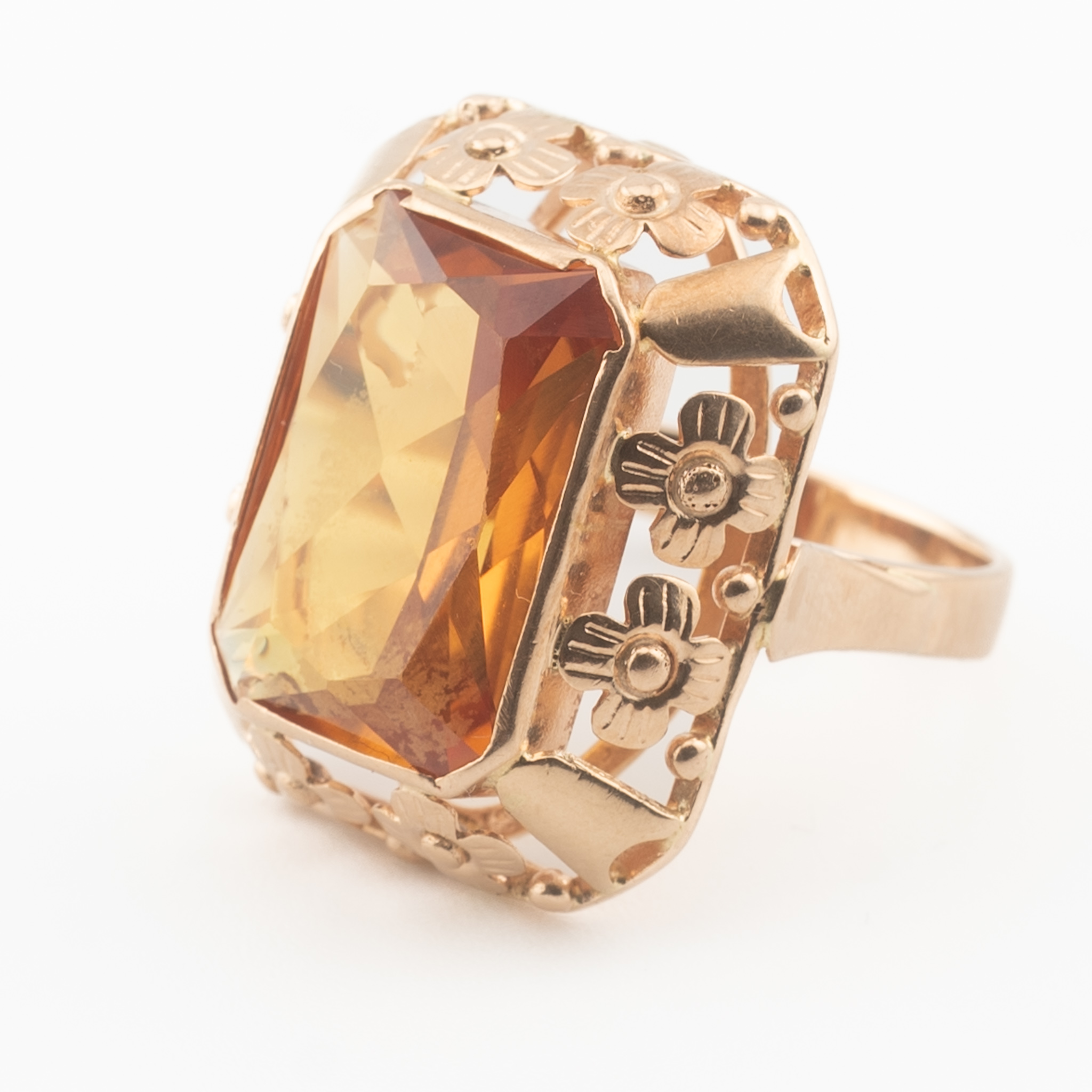 Pierścionek pochodzący z okresu PRL, zdobiony dużym, syntetycznym korundem w barwie padparadża – rzadko spotykanym odcieniu łączącym ciepły pomarańcz z różem. Kamień w szlifie prostokątnym został osadzony w ozdobnej oprawie z motywem kwiatów, charakterystycznej dla wzornictwa biżuterii tego okresu. Wyrazista forma i intensywna barwa czynią z tego modelu efektowny element kolekcji biżuterii vintage.