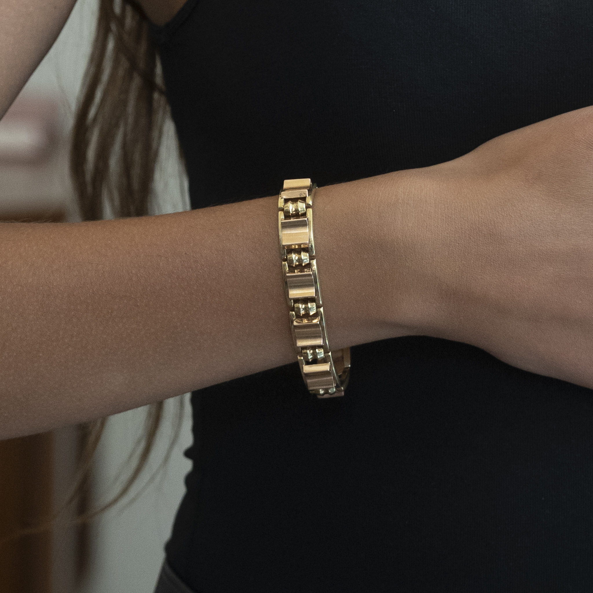 Klasyczna bransoletka wykonana z żółtego złota próby 0,585, stworzona z solidnych, prostokątnych ogniw o elegancko wypolerowanej powierzchni. Minimalistyczny, geometryczny wzór sprawia, że biżuteria doskonale komponuje się zarówno z codziennymi, jak i formalnymi stylizacjami.