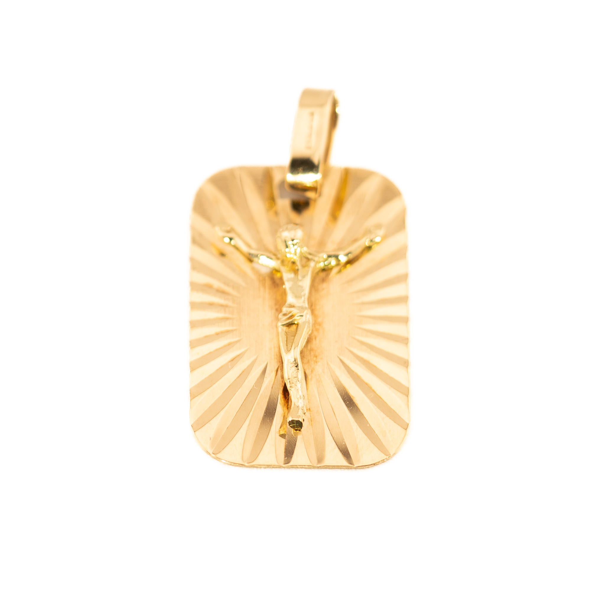 Złota zawieszka wykonana ze złota próby 0,585, przedstawiająca wizerunek Jezusa na prostokątnej płytce z promienistym tłem. Elegancka i symboliczna biżuteria o duchowym znaczeniu, idealna jako osobisty medalik lub prezent na ważną uroczystość.