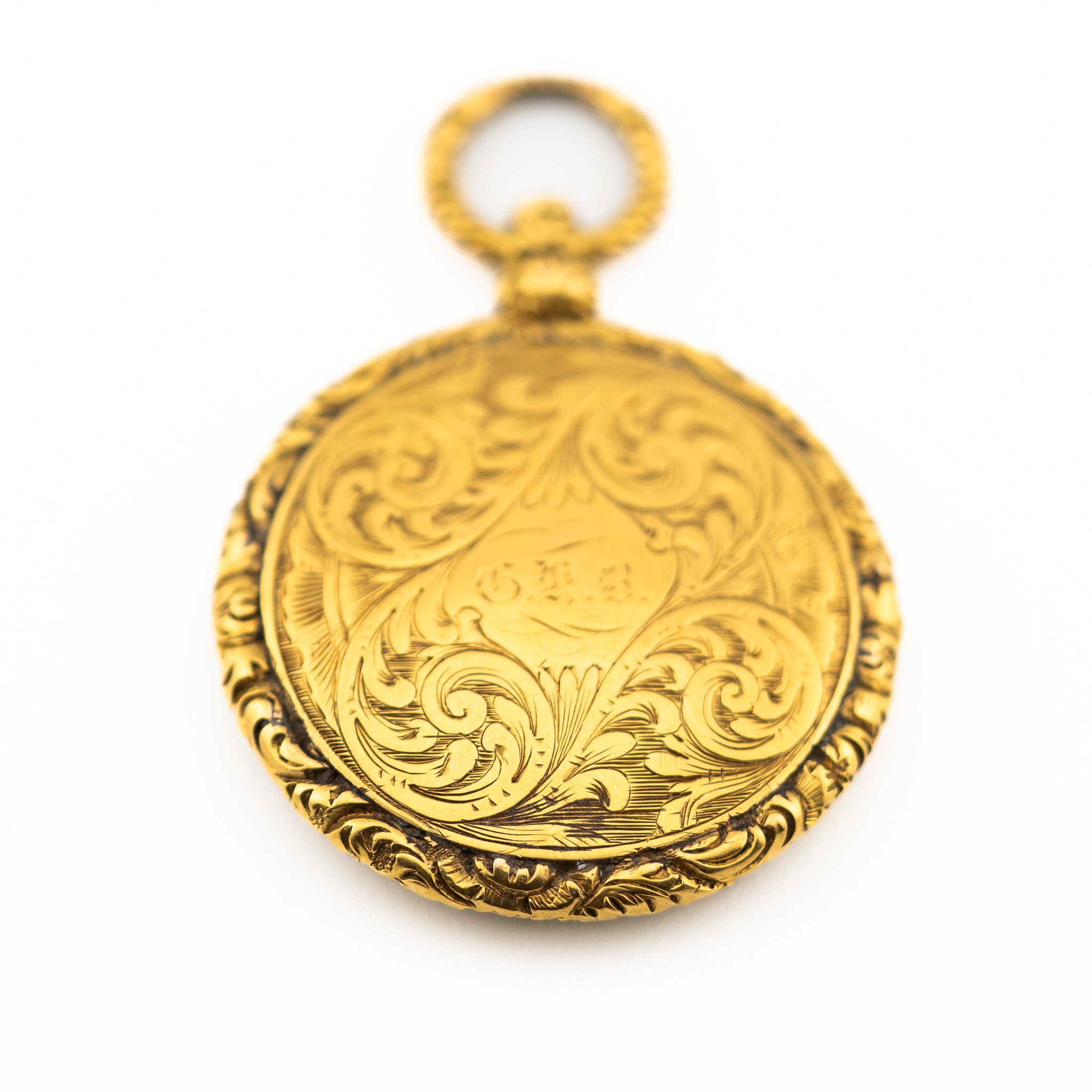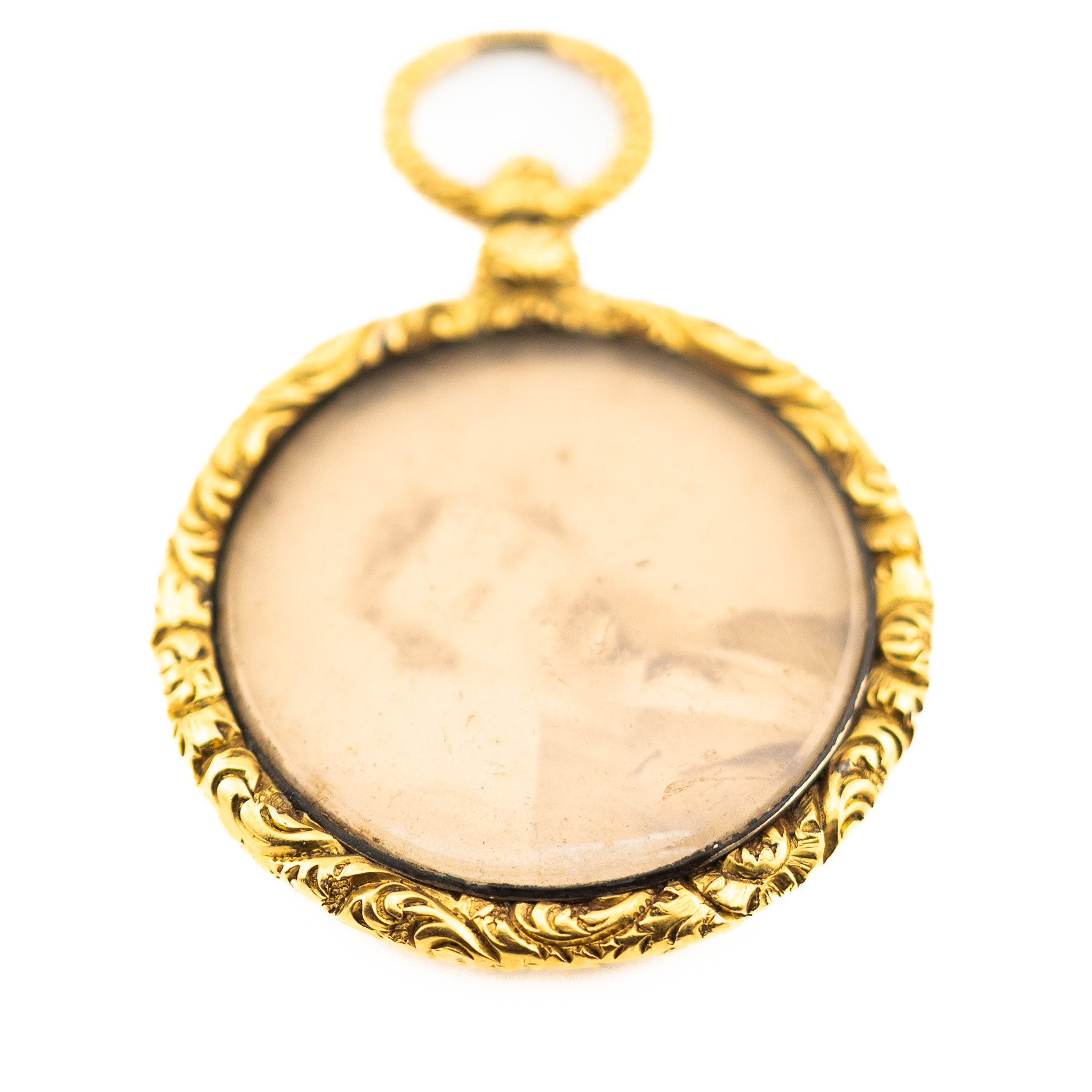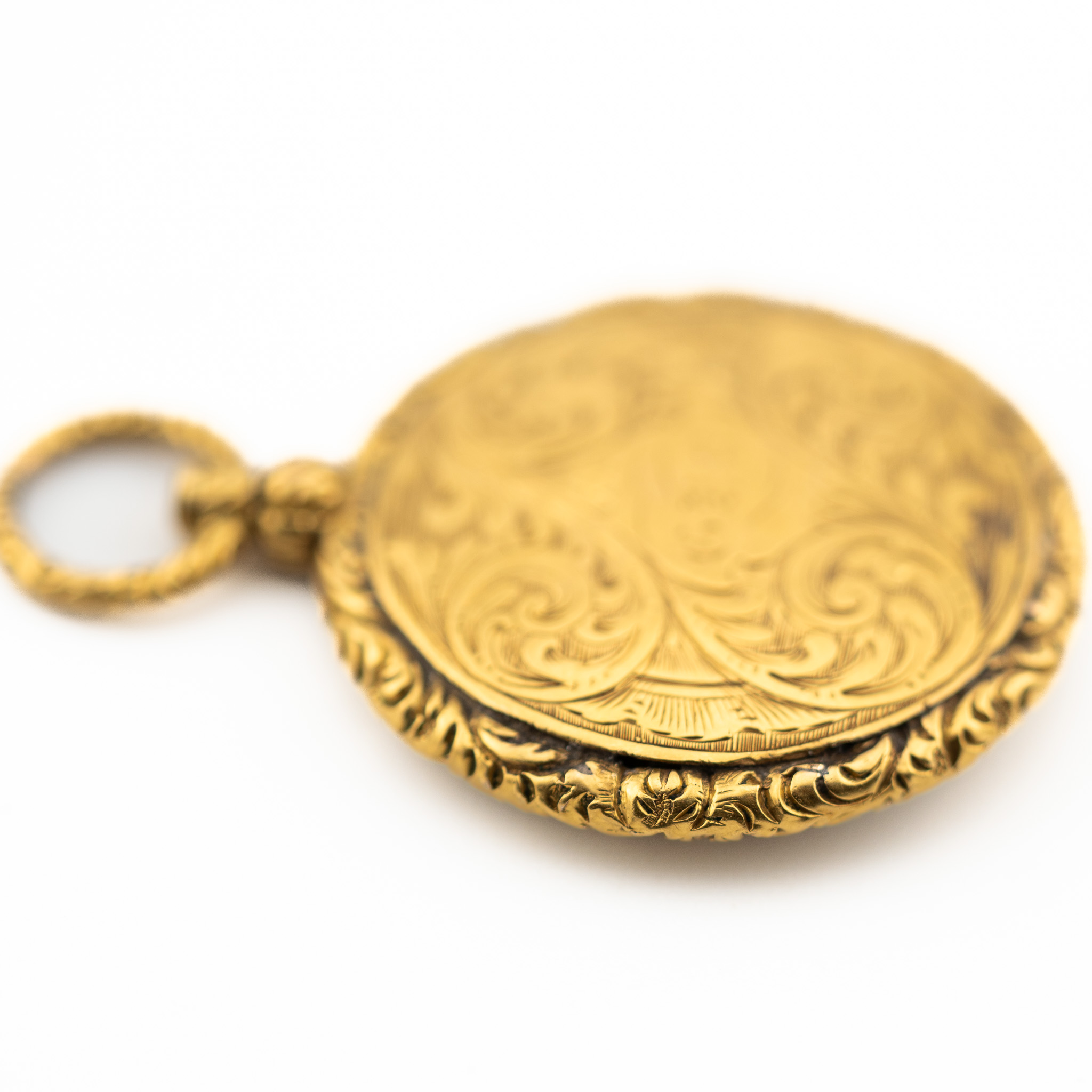 Zabytkowy medalion portretowy z XIX wieku, wykonany ze złota próby 0,585. Forma inspirowana klasyczną kopertą zegarka kieszonkowego, z bogato grawerowaną rewersem i szklaną oprawą z przodu, przeznaczoną na portret lub fotografię. Piękny, rzadko spotykany obiekt o wyraźnym charakterze antykwarycznym, idealny dla kolekcjonera lub miłośnika historycznej biżuterii.