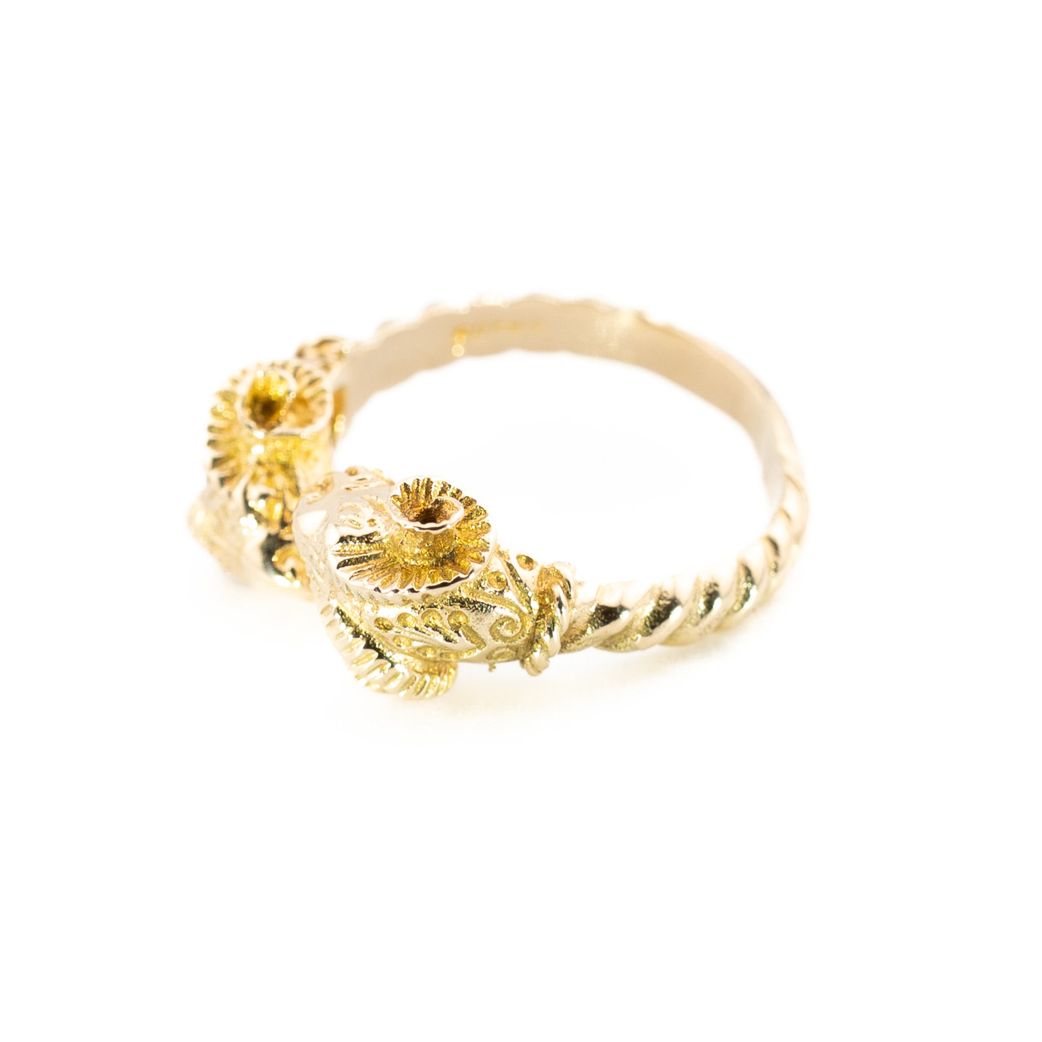 Pierścionek wykonany ze złota próby 0,585, zdobiony motywem baranków. Nietypowa forma sprawia, że wyróżnia się wśród klasycznych wzorów. To ciekawa propozycja dla osób poszukujących oryginalnej biżuterii o symbolicznym charakterze.