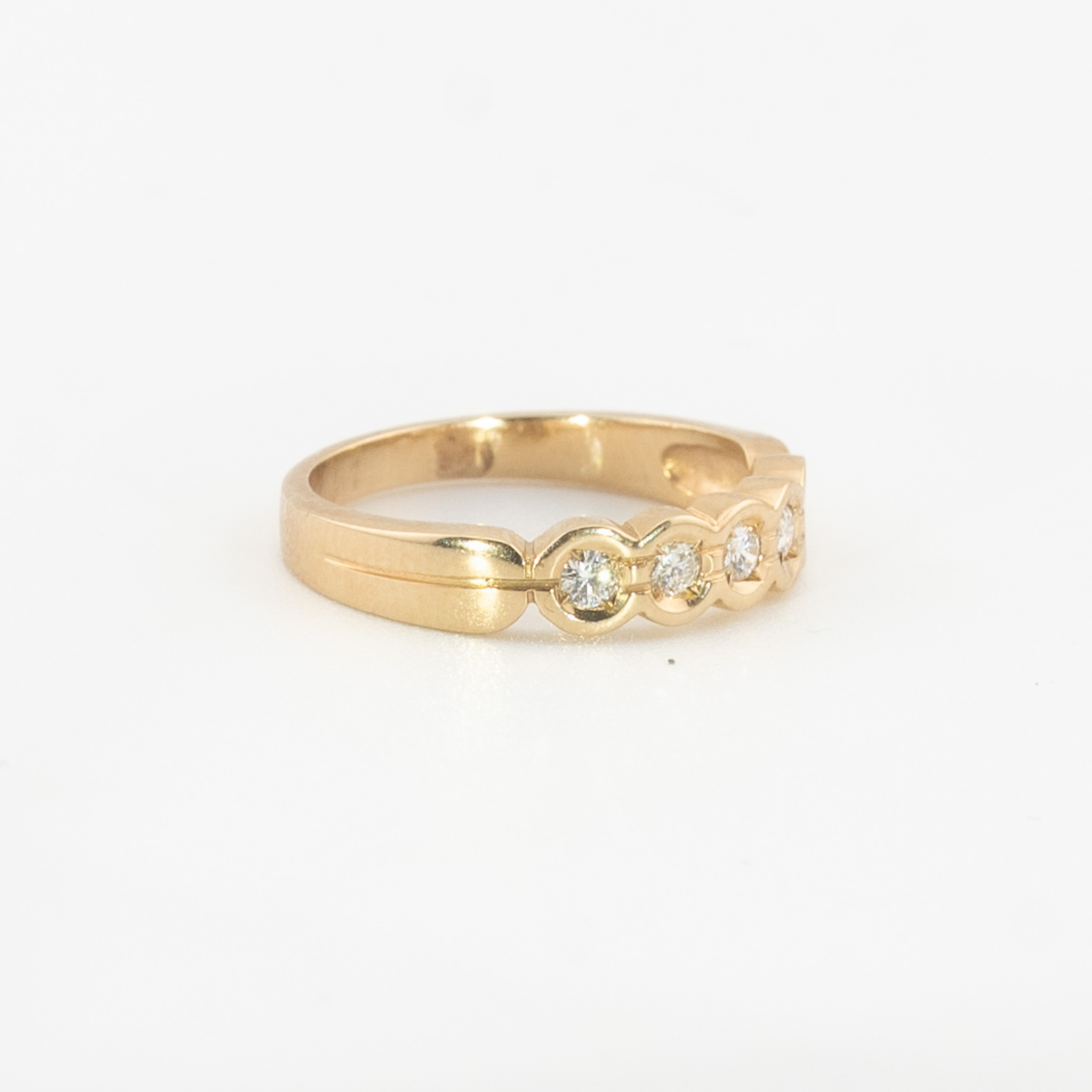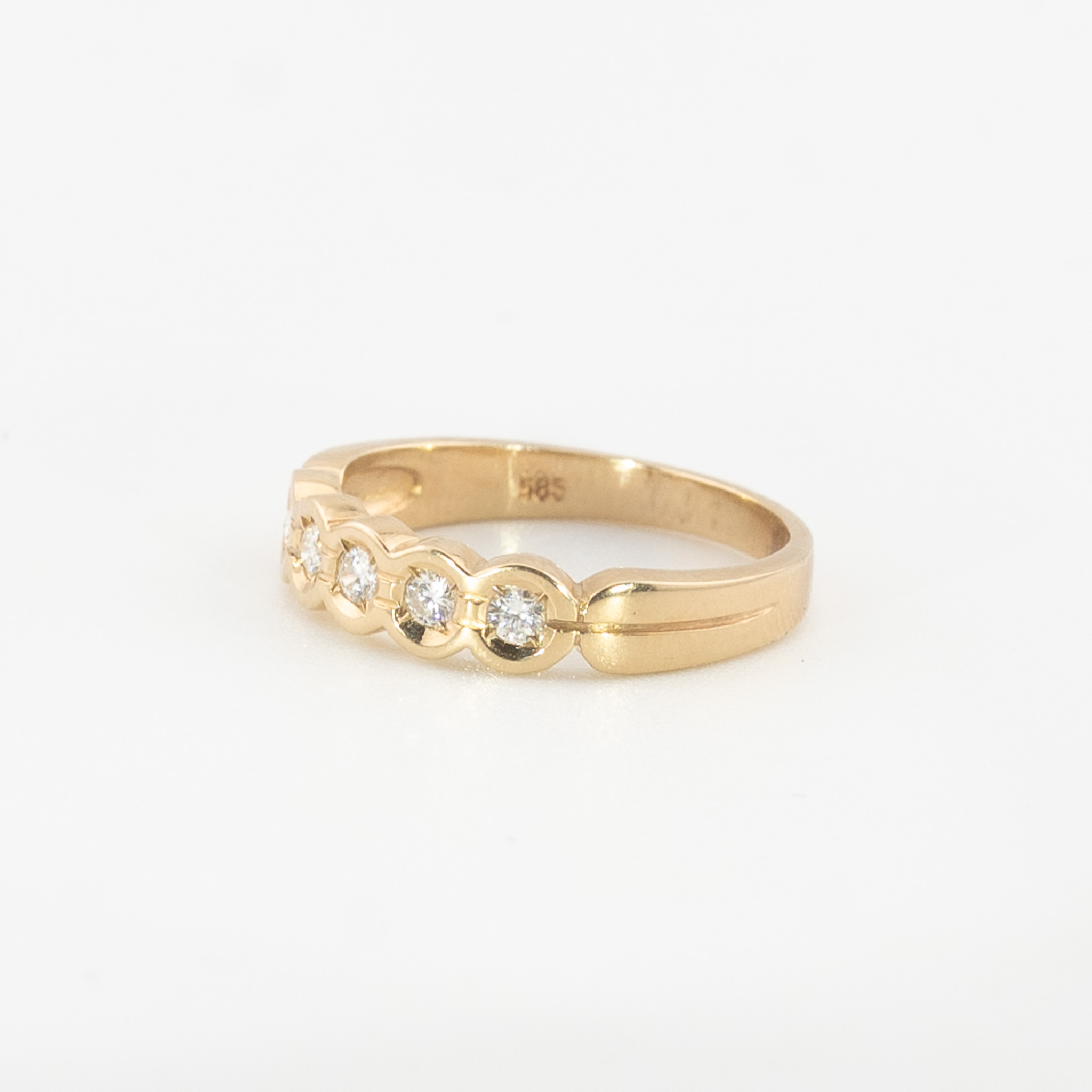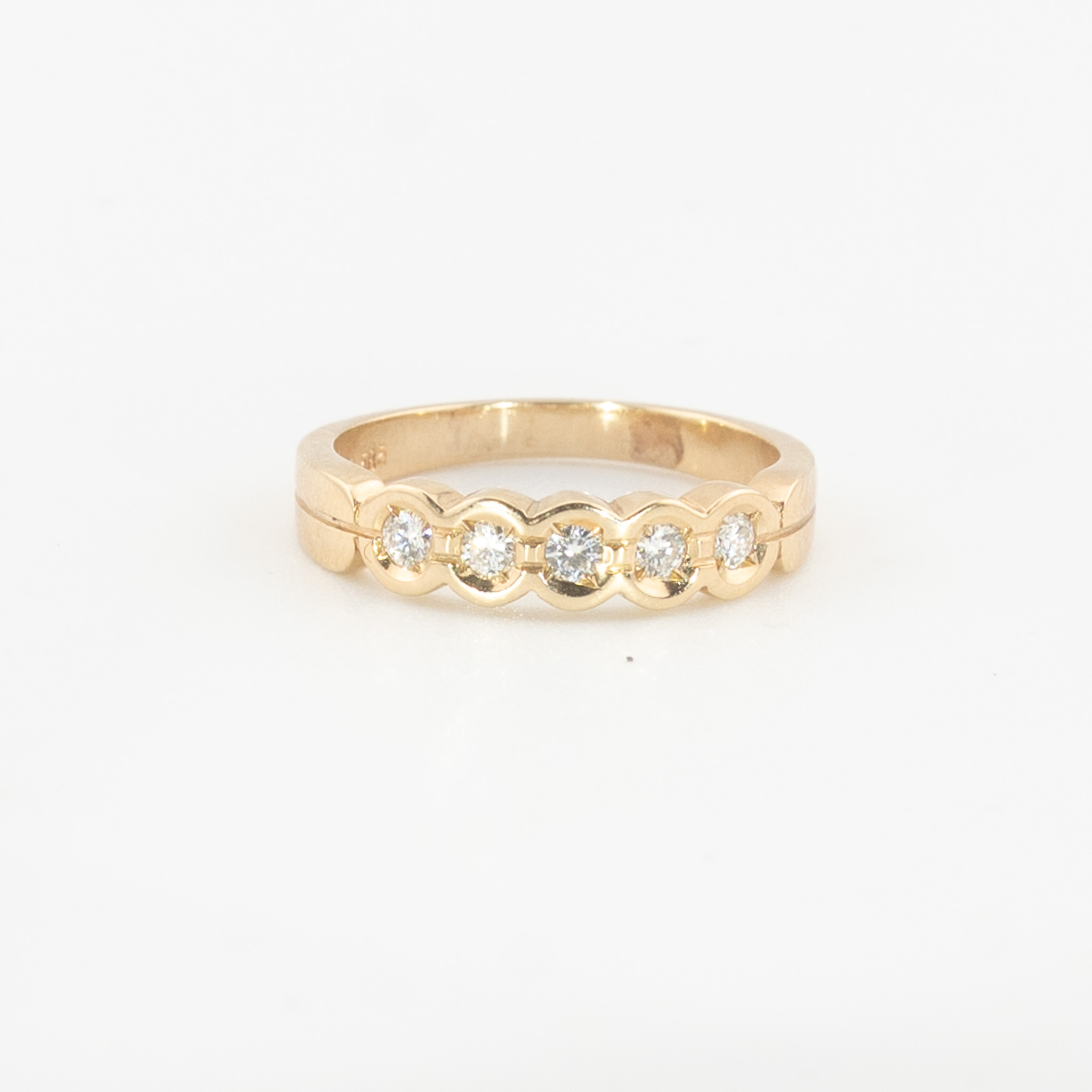 Klasyczny pierścionek wykonany ze złota próby 0,585, ozdobiony rzędem pięciu naturalnych diamentów. Kamienie osadzone są w dekoracyjnej oprawie o subtelnie falistym kształcie, która podkreśla ich blask. Prosty, elegancki design sprawia, że pierścionek jest uniwersalnym dodatkiem, pasującym zarówno do codziennych stylizacji, jak i na wyjątkowe okazje.