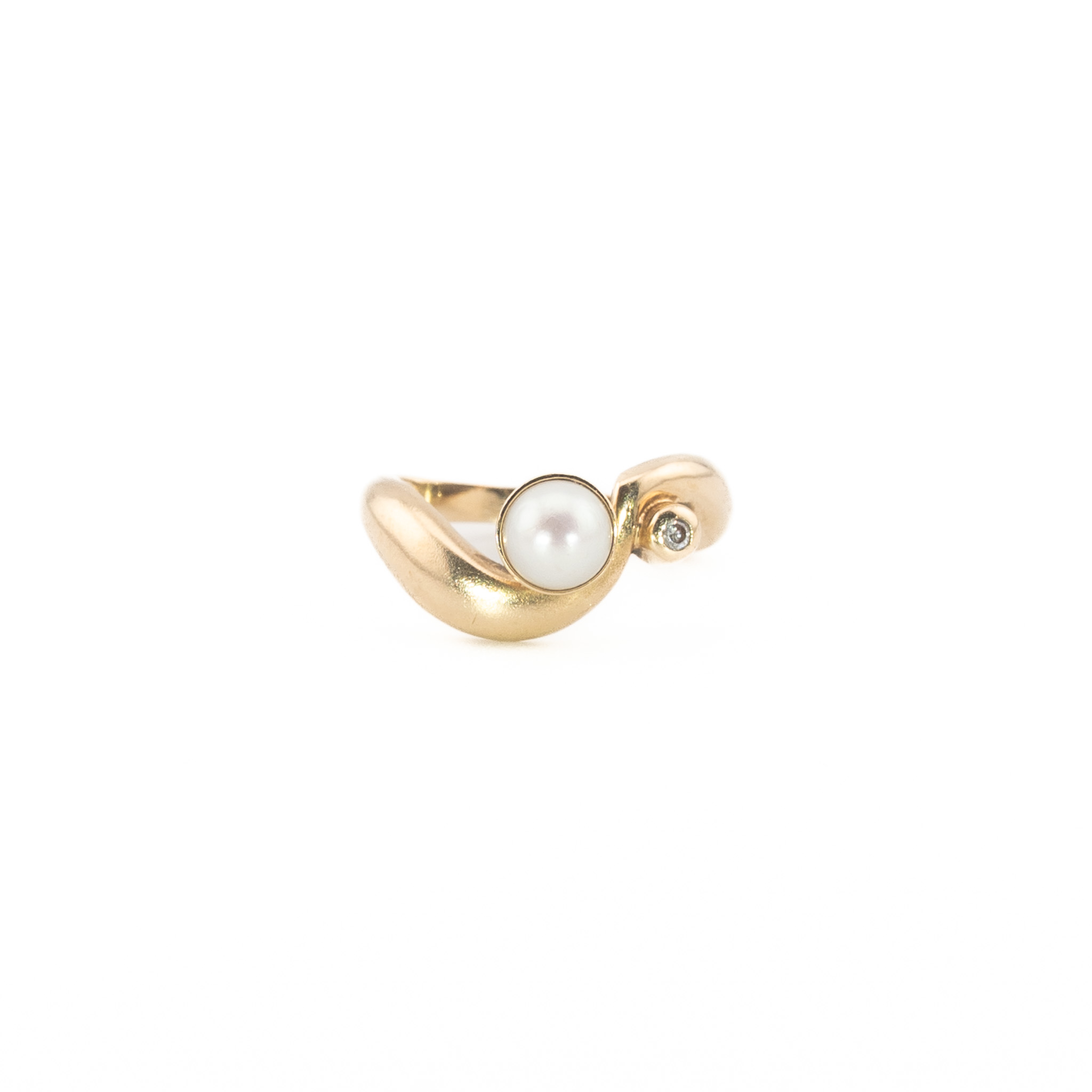Złoty pierścionek wykonany ze złota próby 0,585. Zdobiony perełką hodowaną i niewielką cyrkonią, ma prostą i elegancką formę. Sprawdzi się zarówno na co dzień, jak i jako subtelny dodatek na specjalne okazje.